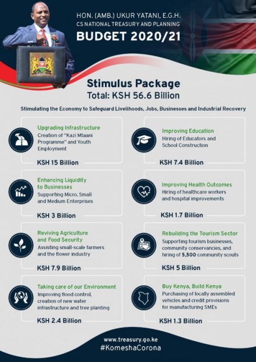 The government, through the National Treasury, has set aside 56.6 billion shillings under the economic stimulus package that will help in shielding the economy against the effects of Covid-19.