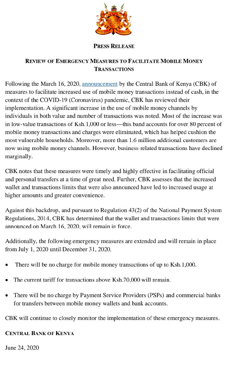 Kenyans will continue sending 1000 shillings and below via M-Pesa at not transition charge for the next five months to December 2020 following a directive from the Central Bank of Kenya.