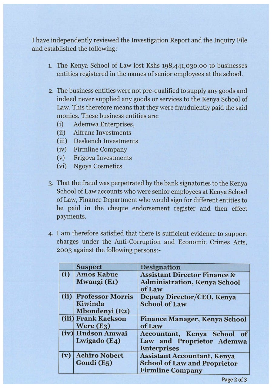 “Upon completion of the investigations, the EACC on May 17, 2020, forwarded the investigation file and the report with recommendations that the suspects, some of whom are senior employees of the Kenya School of Law, be charged with various offenses,” the DPP said.