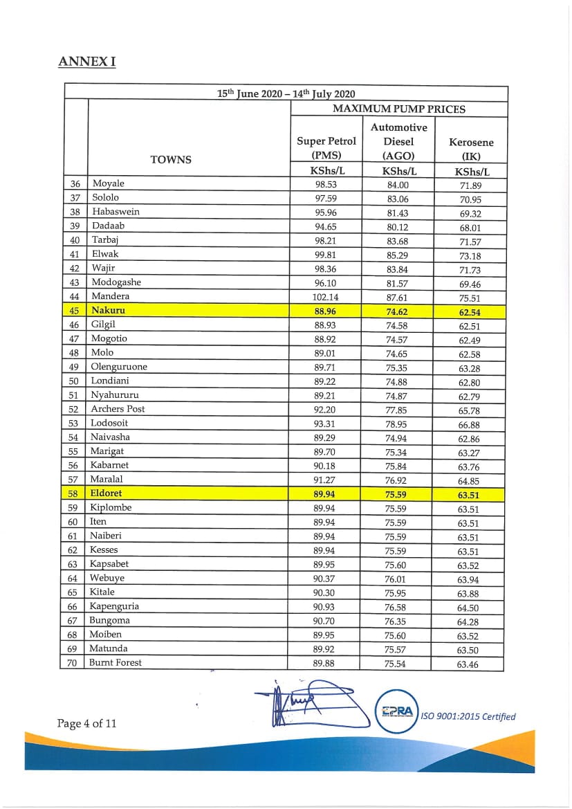 Those in Eldoret will pay 89.94 shillings for a liter of Super Petrol, 75.89 shillings for a liter of Diesel, and 63.51 shillings for a liter of Kerosene.
