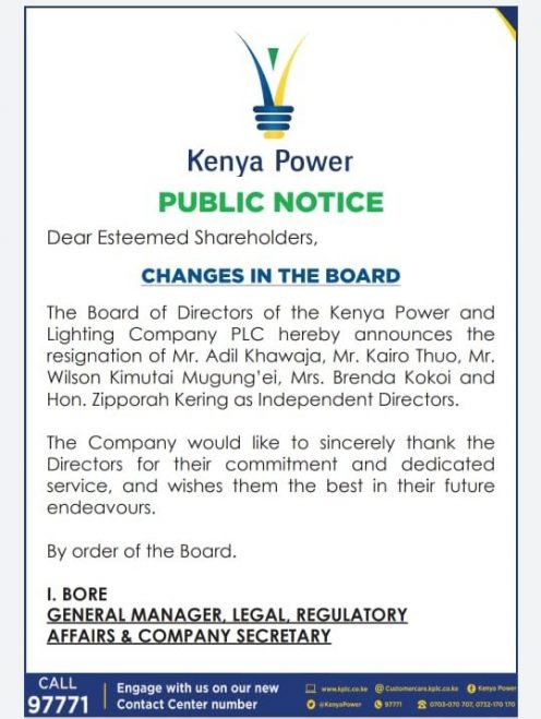“The company would like to sincerely thank the Directors for their commitment and dedicated service, and wishes them the best in their future endeavours,” said Kenya Power in a statement.