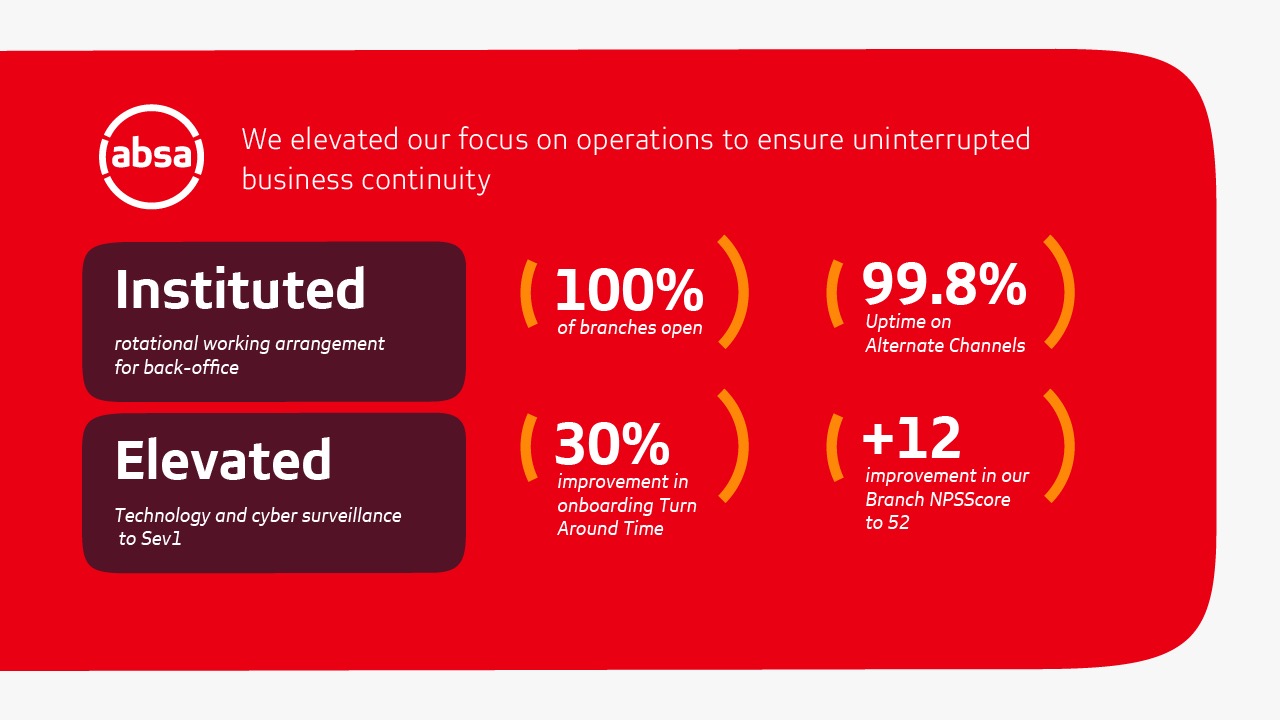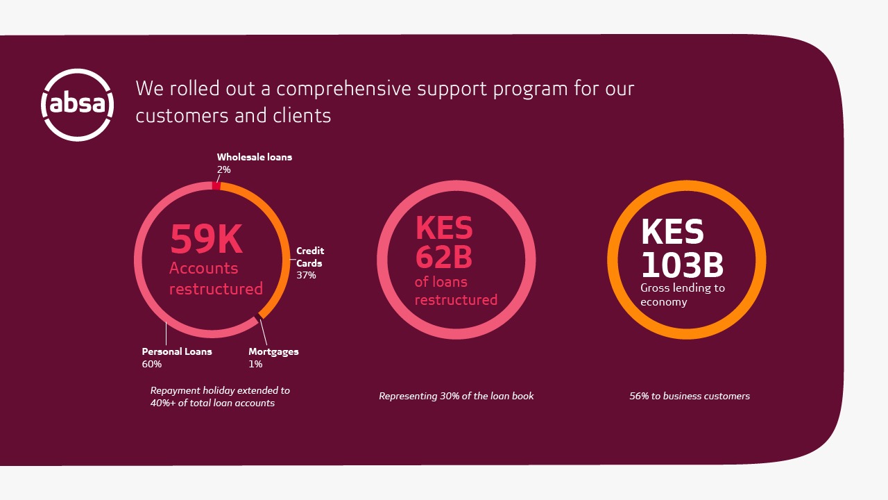 “Our priority has been supporting our customers whether on loan restructures or waiving fees. During the period we have provided loan reliefs of Ksh.62 billion representing 59,000 accounts” said Mr. Jeremy Awori, the CEO of Absa Bank Kenya.
