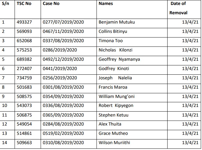 Pursuant to section 30 of the Teacher Service Commission 2012, TSC has published the names of teachers that it has removed from its register of teachers.