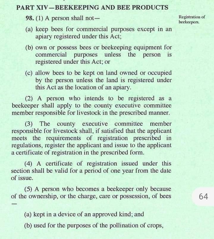 According to the Bill, a person who intends to be registered as a beekeeper shall apply to the county executive committee member responsible for livestock in the prescribed manner. “A certificate of registration issued under this section shall be valid for a period of one year from the date of issue.”