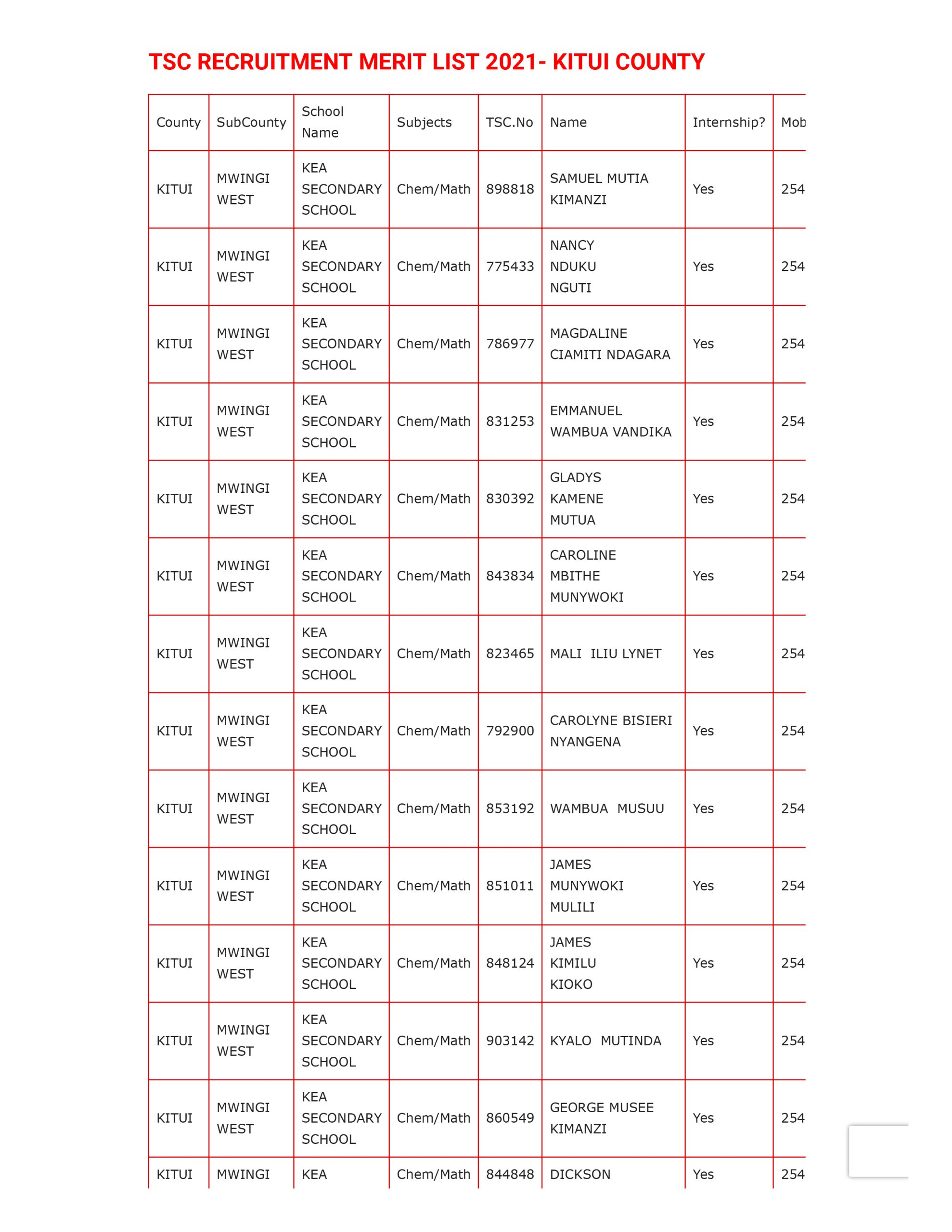 The Teacher Service Commission (TSC) has released the merit lists for the shortlisted teachers in the July 2021 recruitment exercise.