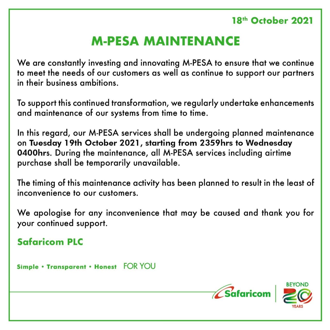 “Our M-Pesa services shall be undergoing planned maintenance on Tuesday 19th October 2021 starting from 2359 hours to Wednesday 0400 hours,” said Safaricom.