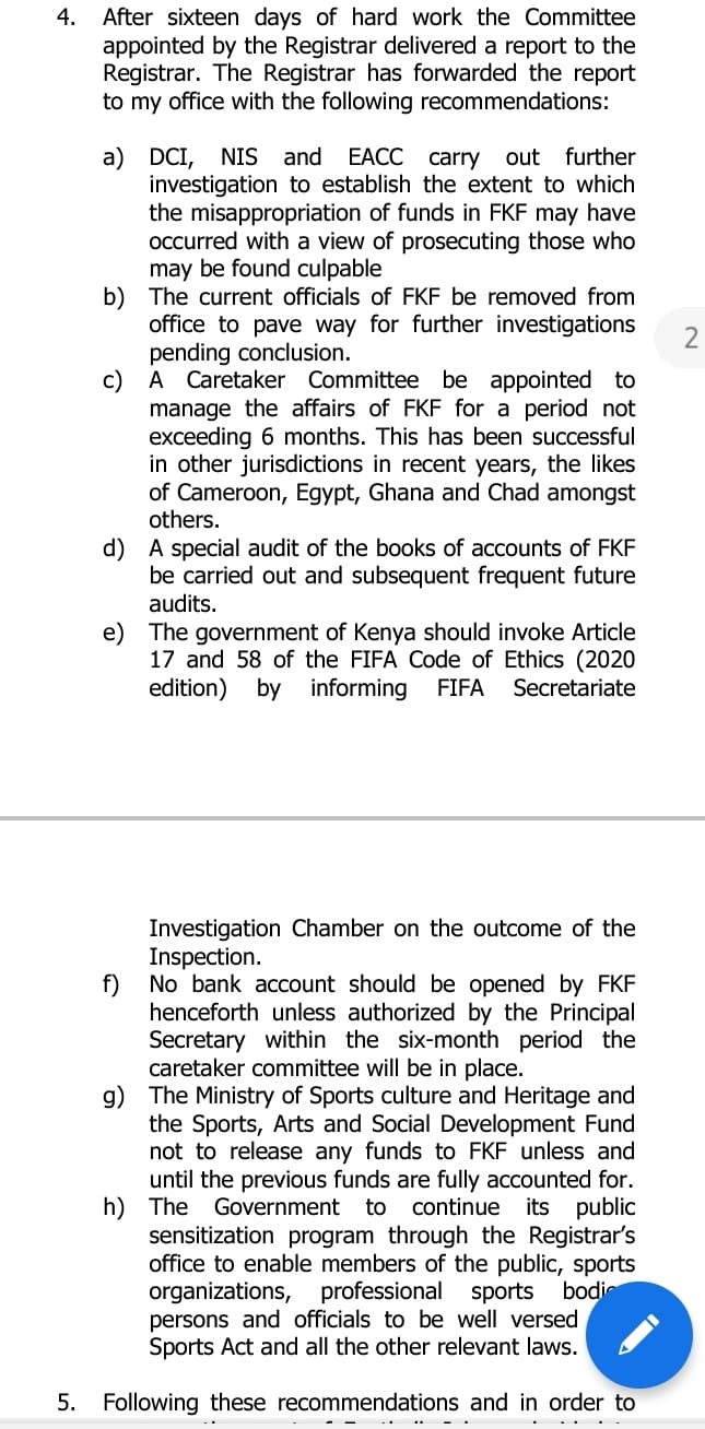 The CS has appointed a caretaker committee to take over the running of the FKF. The committee will include: