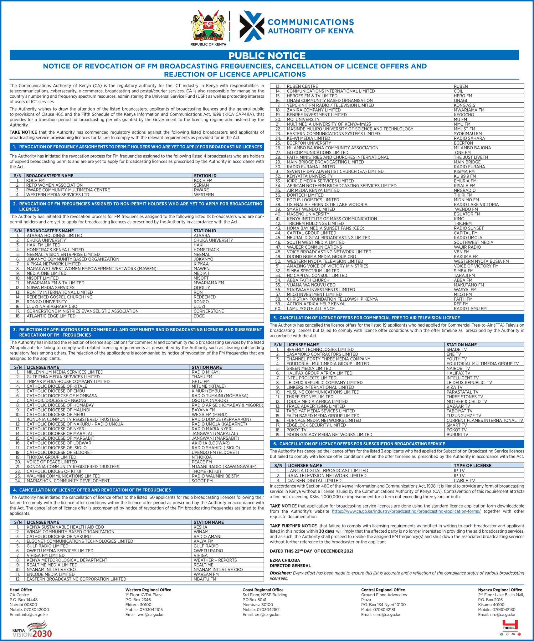 The Communication Authority of Kenya has revoked hundreds of licenses and permits.