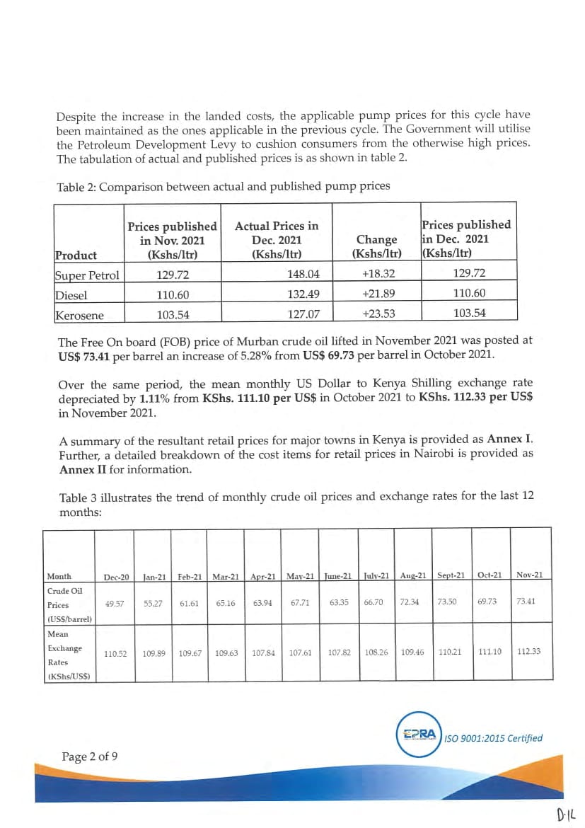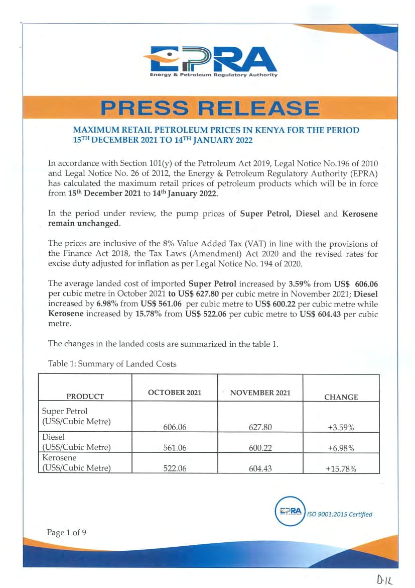 “Despite the increase in the landed costs, the applicable pump prices for this cycle have been maintained as per the ones applicable in the previous cycle. The Government will utilize the Petroleum Development Levy to cushion consumers from the otherwise high prices,” said EPRA.