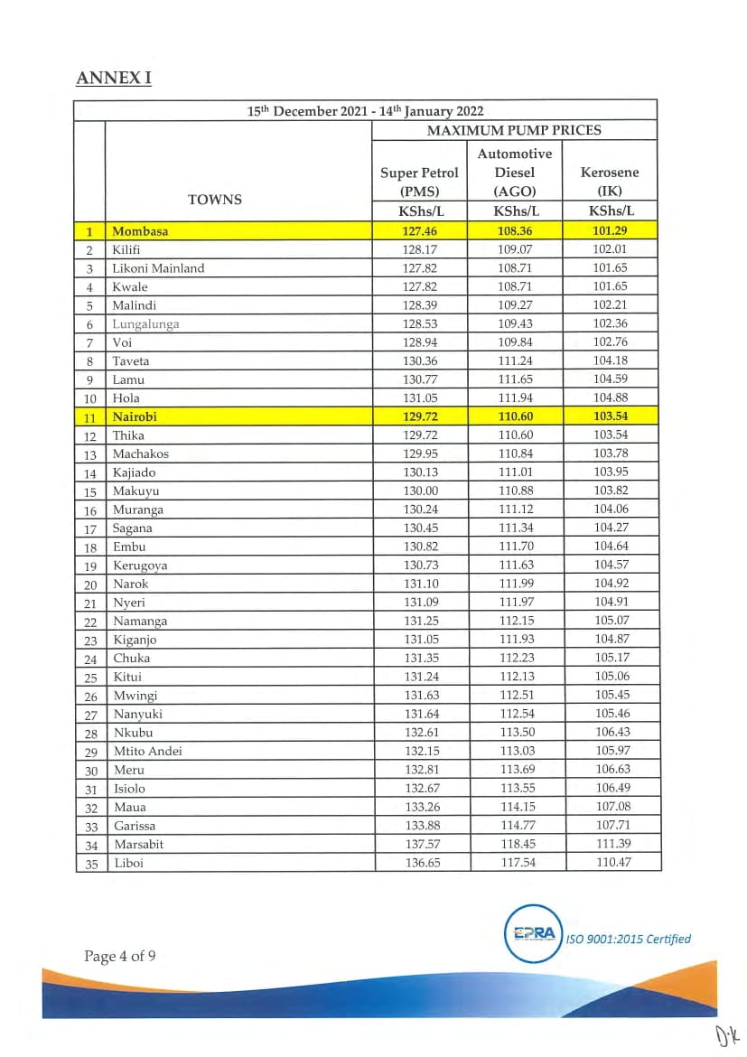 The pump prices have been retained at 129.72 and 110.60 shillings per liter of super and diesel in Nairobi. Kerosene to retail at 103.54 shillings.