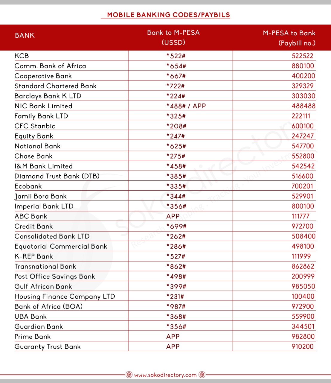 Here are the paybills and USSD Codes for transacting between your bank and M-Pesa: