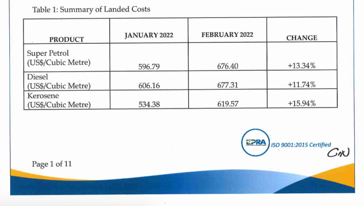 EPRA says the landed cost of imported Super Petrol rose by 13.34 percent from 596.79 dollars to 676.40 dollars per cubic meter while that of Diesel rose by 11.7 percent from 606.16 dollars to 677.31 dollars per cubic meter.