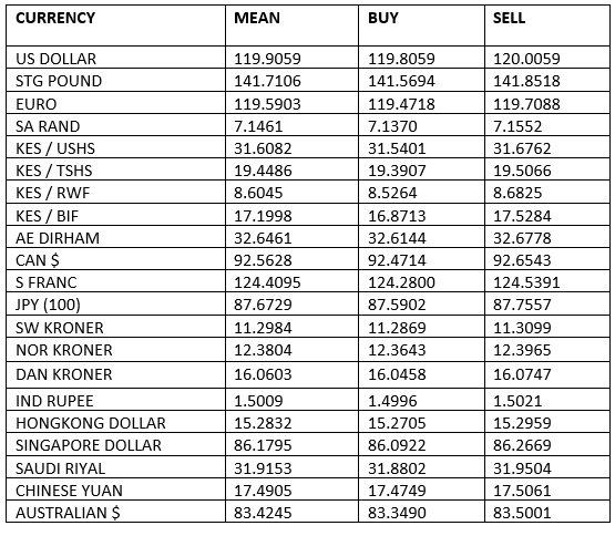 Commercial Banks in Kenya were on Thursday buying the US Dollar at an average of 119.80 shillings and selling it at 120.0 shillings with a mean across all commercial banks standing at 119.90 shillings to the dollar.