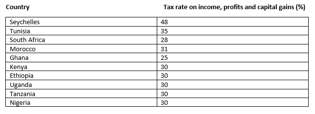 The table below shows the tax rates on income, profits, and capital gains of some selected African countries in 2020: