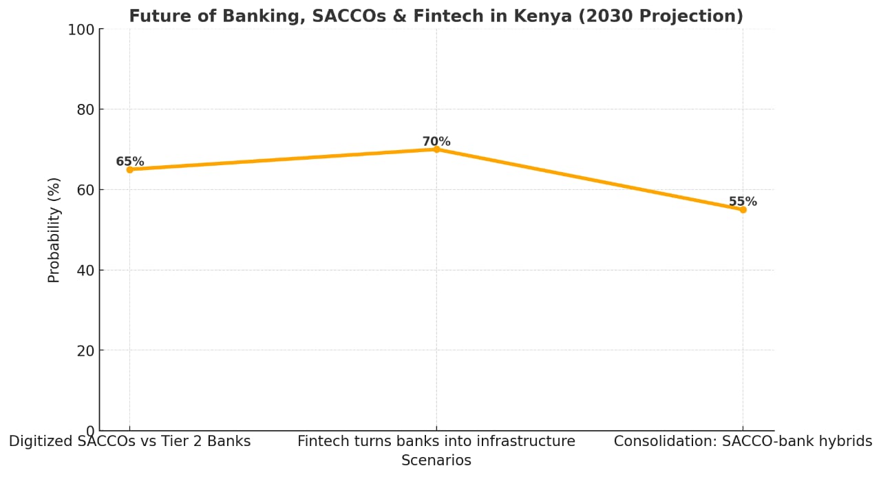 70 % chance that fintech disruption will relegate banks to infrastructure providers—credit, payments, liquidity plumbing 55 % chance that consolidation will produce hybrid SACCO-bank institutions
