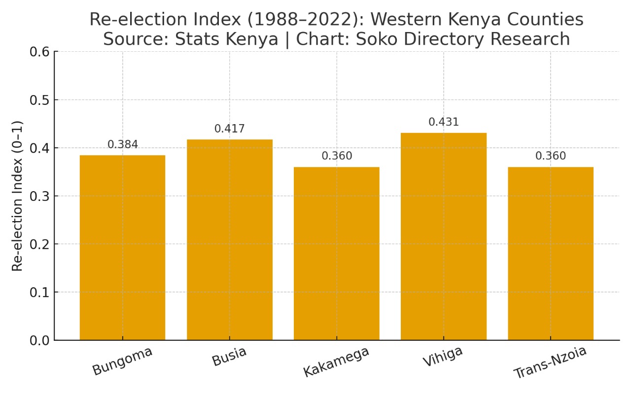 For more than three decades, Western Kenya has become a museum of political nostalgia. The data from Stats Kenya’s Re-election Index (1988–2022) paints an unflattering picture: Bungoma (0.384), Busia (0.417), Kakamega (0.360), Vihiga (0.431), and Trans-Nzoia (0.360). These figures mean that the region consistently rewards the same names election after election—faces that long ago stopped representing the future. It’s a cycle of comfort masquerading as loyalty. What should be a democracy of ideas has morphed into a dynasty of memories, where voters cling to the devils they know, even when those devils have built nothing new.