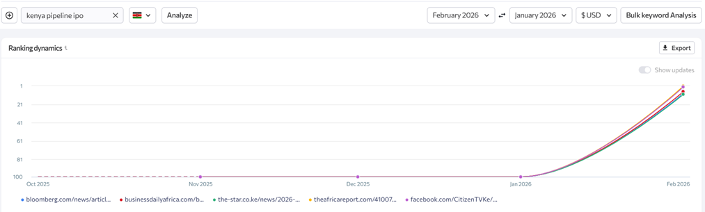 ‘Kenya pipeline ipo’ — Bloomberg, Business Daily, The Star, The Africa Report, and Citizen TV, ranking from position 80–100 to position 1–5, October 2025 to February 2026
