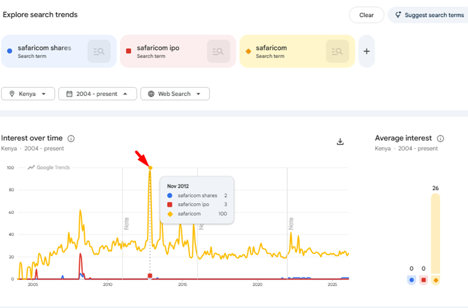 The Safaricom Google Trends history adds another layer. Look at what happened in November 2012, four years after the IPO.
