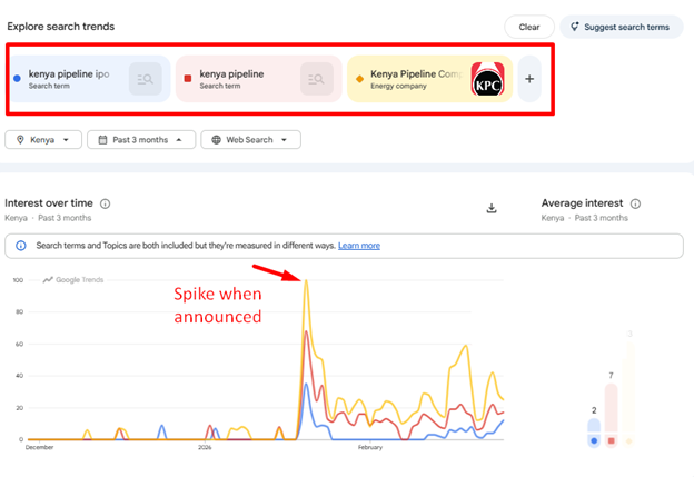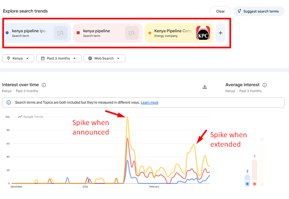 Google Trends: ‘kenya pipeline ipo’ + ‘kenya pipeline’ + KPC brand — spike to 100 on January 19 when IPO opened, second spike in February when extension was announced. Kenya, past 3 months.